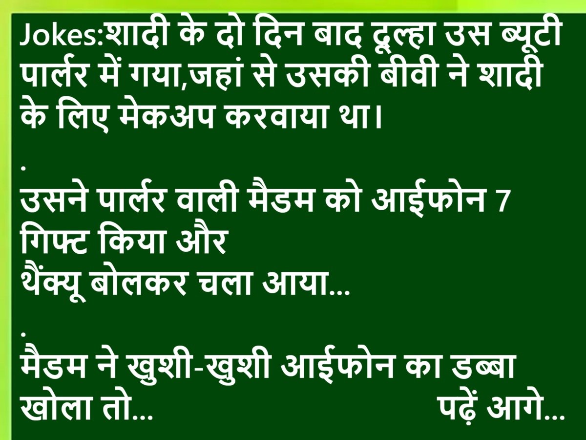 Joke 1:शादी के दो दिन बाद दूल्हा उस ब्यूटी पार्लर में गया,जहां से उसकी बीवी ने शादी के लिए मेकअप करवाया था।.उसने पार्लर वाली मैडम को आईफोन 7 गिफ्ट किया औरथैंक्यू बोलकर चला आया....मैडम ने खुशी-खुशी आईफ...