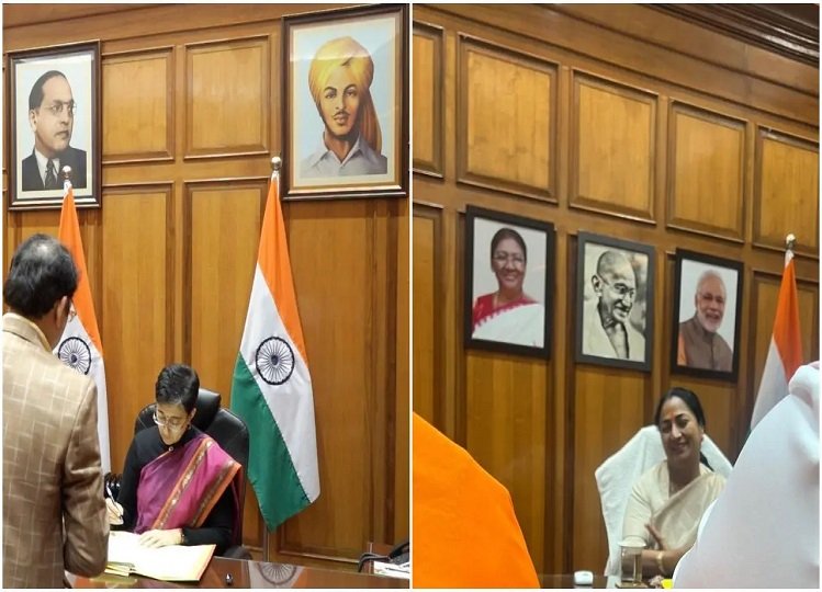 इंटरनेट डेस्क। दिल्ली में सत्ता ही बदल गई हैं, सीएम ही बदल गया हैं तो फिर सरकारी ऑफिसों से लेकर सीएमओ तक हर चीज में बदलाव होना तय है। ऐसे में सत्ता परिवर्तन के बाद अब ‘तस्वीर विवाद’ ने राजनीतिक माहौल को गरमा दिया है। दरअसल पूर्व मुख्यमंत्री और आप की नेता प्रतिपक्ष आतिशी ने सीएम रेखा गुप्ता पर निशाना साधते हुए कहा दो तस्वीरें जारी की। इनमें से एक में आतिशी मुख्यमंत्री की कुर्सी पर बैठी दिख रही हैं और उनके पीछे बीआर अंबेडकर और भगत सिंह की तस्वीरें लगी हैं। वहीं दूसरी तस्वीर में मौजूदा मुख्यमंत्री रेखा गुप्ता दिख रही हैं, इसमें एक ही दीवार पर महात्मा गांधी, राष्ट्रपति द्रौपदी मुर्मू और प्रधानमंत्री नरेंद्र मोदी की तस्वीरें दिखाई गई है।