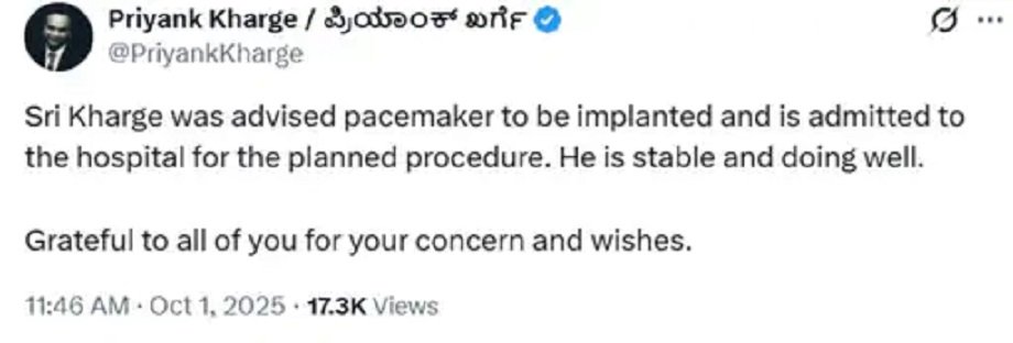 मीडिया रिपोटर्स की माने तो उन्होंने आगे लिखा उनकी हालत स्थिर है और वे बेहतर महसूस कर रहे हैं। आपकी चिंता और शुभकामनाओं के लिए आभारी हूं। प्रियांक से पहले पार्टी सूत्रों ने एजेेंसी को बताया कि खड़गे को मंगलवार को बुखार और पैर में दर्द की शिकायत के बाद बेंगलुरु अस्पताल ले जाया गया। वहां के डॉक्टर उनकी देखभाल कर रहे हैं।