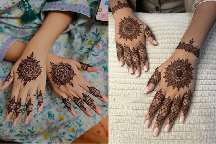 ये सिंपल लेकिन ट्रेंडी मेहंदी डिजाइन बेहद ही खूबसूरत है।  इसमें हथेली के बीचोंबीच एक सुंदर गोल फ्लोरल पैटर्न बनाया जाता है और चारों तरफ छोटे-छोटे डॉट्स और बेलें सजाई जाती हैं।