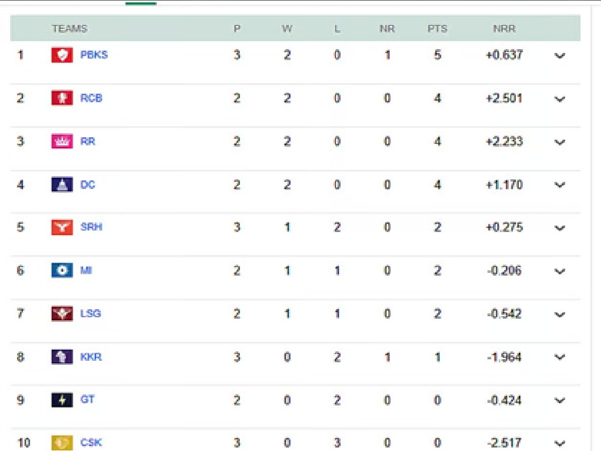 इस बीच, कोलकाता नाइट राइडर्स ने अपना खाता खोला है और एक स्थान ऊपर चढ़कर आठवें स्थान पर पहुंच गई है। मैच कैंसिल होने से पहले टॉप पर मौजूद RCB अब दूसरे स्थान पर है। जबकि चेन्नई सुपर किंग्स पॉइंट्स टेबल में सबसे नीचे है।