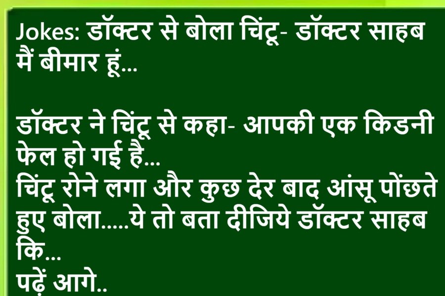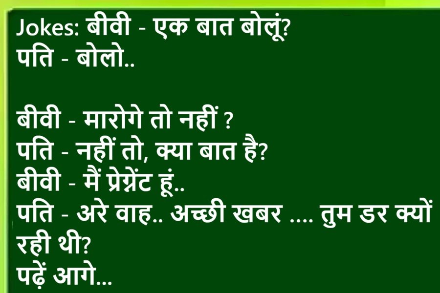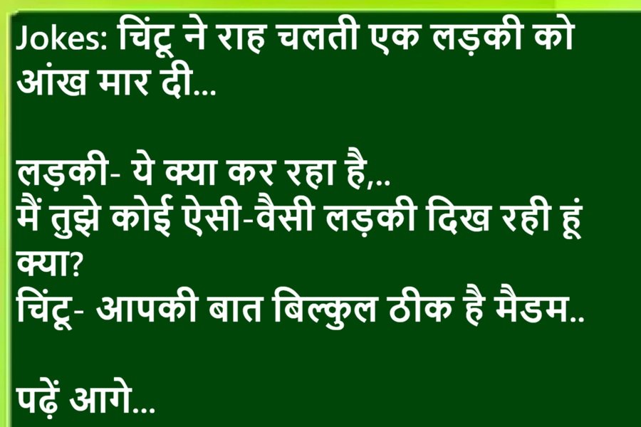 Joke 1:चिंटू लड़की देखने गया'कितने तक पढ़ी हो'लड़की: B.A तकचिंटू ने मना कर दियाऔर बोला दो अक्षर पढ़ी है, वो भी उलटा.Joke 2:लड़का: मैं उस लड़की से शादी करूंगा, जो मेहनती हो, सादगी से रहती हो,घर को संवा...