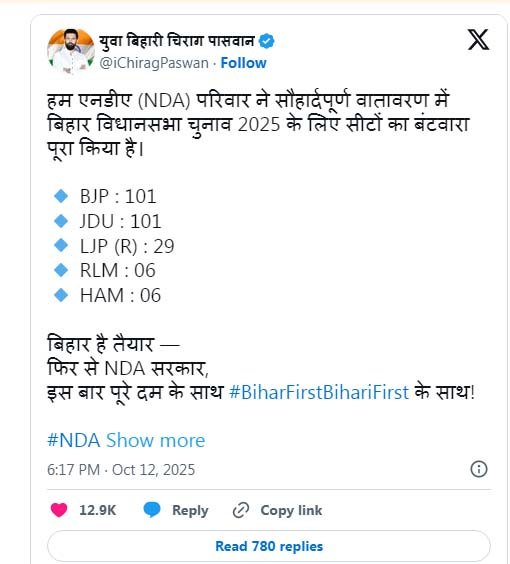 चिराग पासवान ने एक्स (X) पर पोस्ट कर कहा, “हम एनडीए परिवार ने सौहार्दपूर्ण वातावरण में बिहार विधानसभा चुनाव 2025 के लिए सीटों का बंटवारा पूरा कर लिया है।”