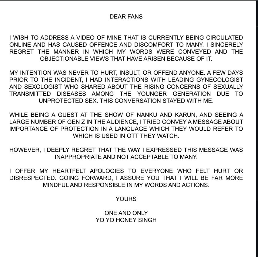 उन्होंने अपने वीडियो मैसेज को एक और माफ़ी के साथ खत्म किया, जिसमें कहा गया- “आप सबसे माफ़ी। आपका अपना यो यो हनी सिंह। इसी तरह प्यार देते रहिए।”