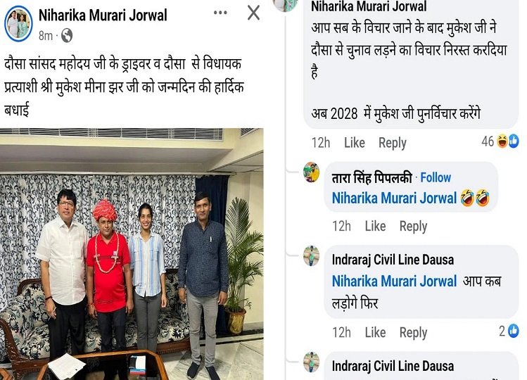 निहारिका जोरवाल ने लिखा, दौसा सांसद महोदय जी के ड्राइवर और दौसा से विधायक प्रत्याशी मुकेश मीना जी को जन्म दिन की बहुत बहुत बधाई। इस पोस्ट से सियासी गलियारे में हलचल तेज हो गई और सोशल मीडिया पर तरह के कमेंट आने लगे। बता दें कि दौसा सीट से मुरारीलाल मीणा भाजपा प्रत्याशी कन्हैयालाल मीणा को हराकर सांसद बने है। मुरारी लाल मीणा बांदीकुई विधानसभा क्षेत्र के अलियापाड़ा गांव के रहने वाले हैं। मुरारी लाल मीणा साल 2003 में बीएसपी के सिंबल पर चुनाव लड़े थे, जहां उन्होंने कांग्रेस के कद्दावर नेता मंत्री शैलेंद्र जोशी को चुनाव हराकर राजनीति में कदम रखा था।
