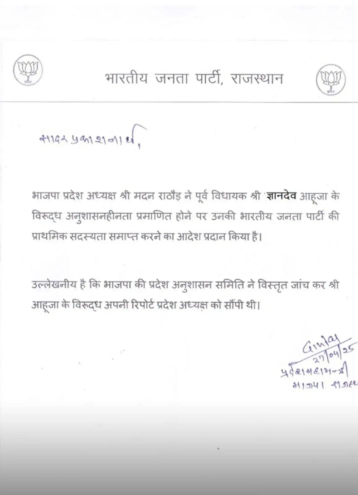 Rajasthan Politics: ज्ञानदेव आहूजा के खिलाफ भाजपा का बड़ा एक्शन, पार्टी ने दिखाया बाहर का रास्ता