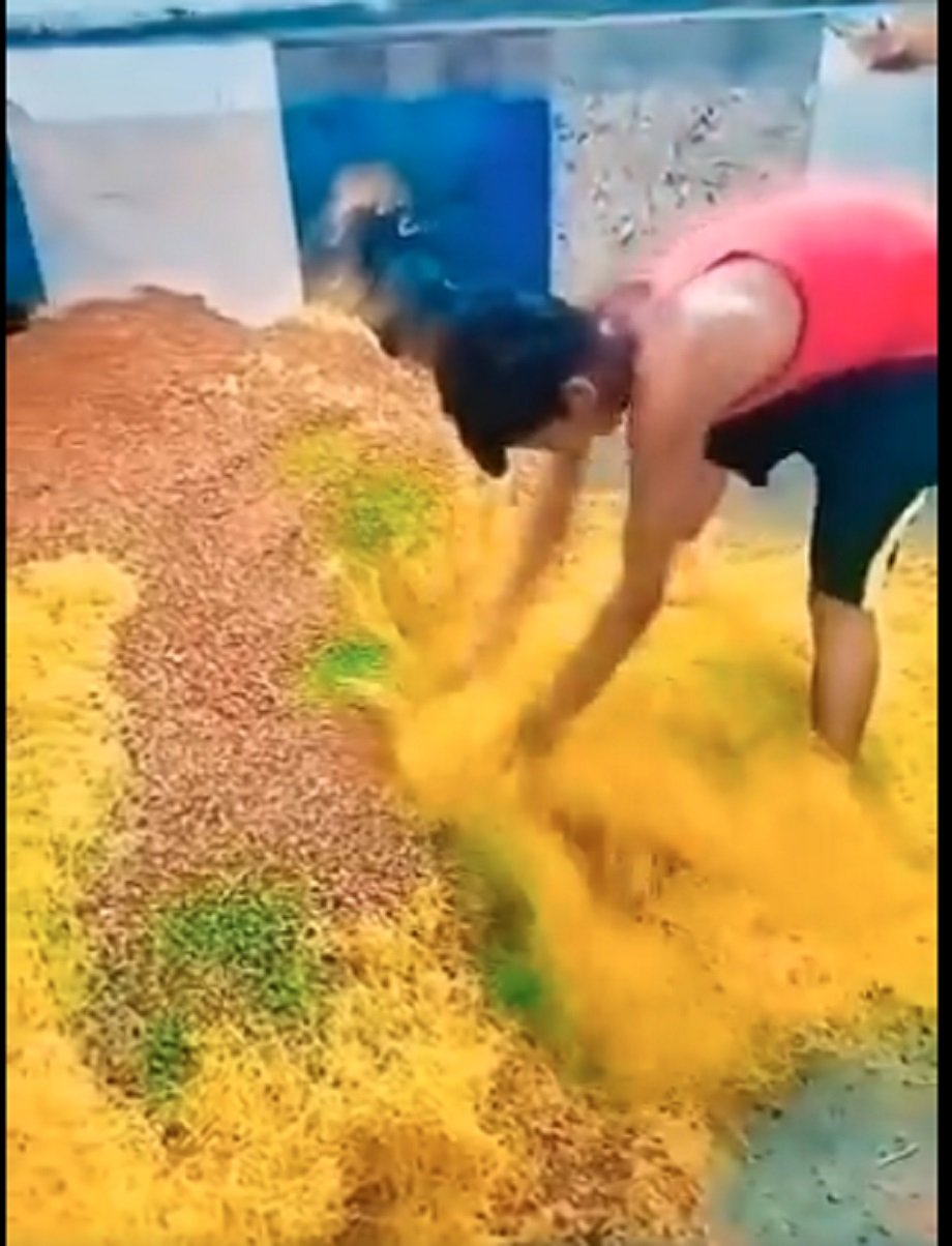 इंटरनेट पर वायरल हो रहे वीडियो में नमकीन को बनाने के बाद उसको मिक्स करने का काम चल रहा है, वीडियो में दिखता है कि एक शख्स मिक्सचर नमकीन को बना रहा है, ऐसे में वो नमकीन पर चढ़कर ही उसे मिला रहा है, वो हाथों से नमकीन को मिला रहा है और एक तरफ से दूसरी ओर फेंक रहा है, इस दौरान वो खुद नमकीन पर ही खड़ा है और नमकीन उसके पैरों के नीचे भी आ रही है।
